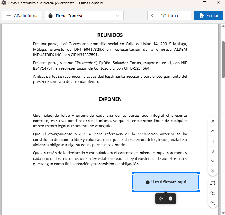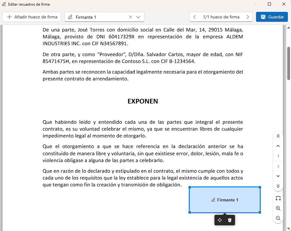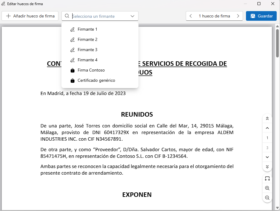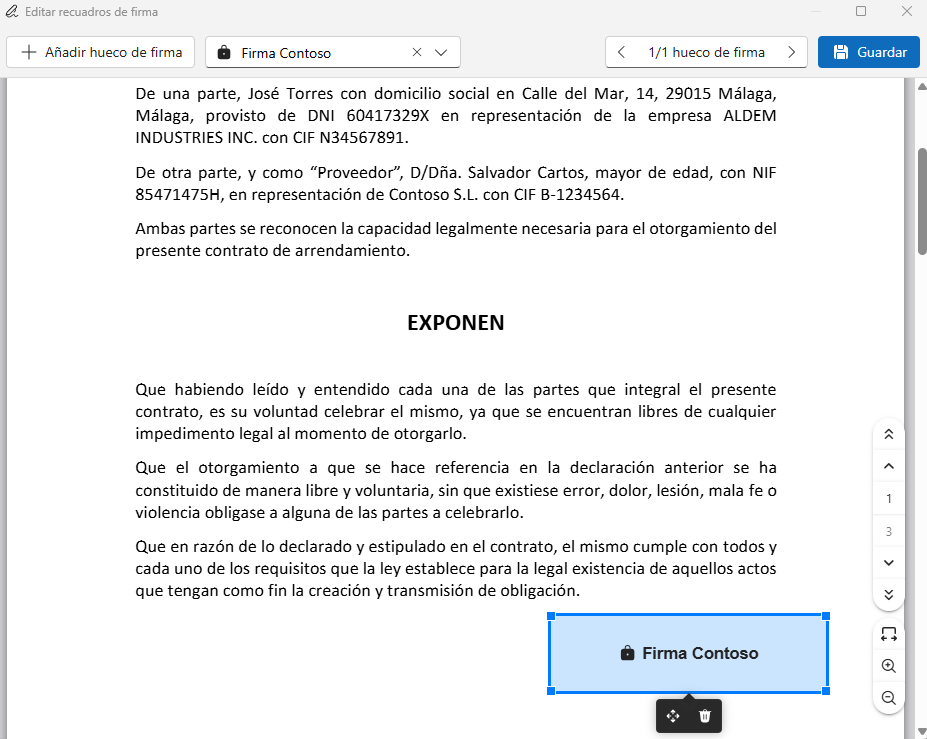 Select the Contoso signature in the “Select a signer” field and click on “Add signature hole” to draw a rectangle on the document: